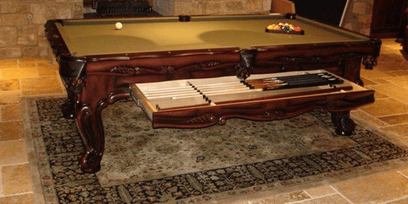 キャバリエビリヤード台は無垢材でできており、フレーム、エプロン、脚に華やかな彫刻のディテールが施されています。